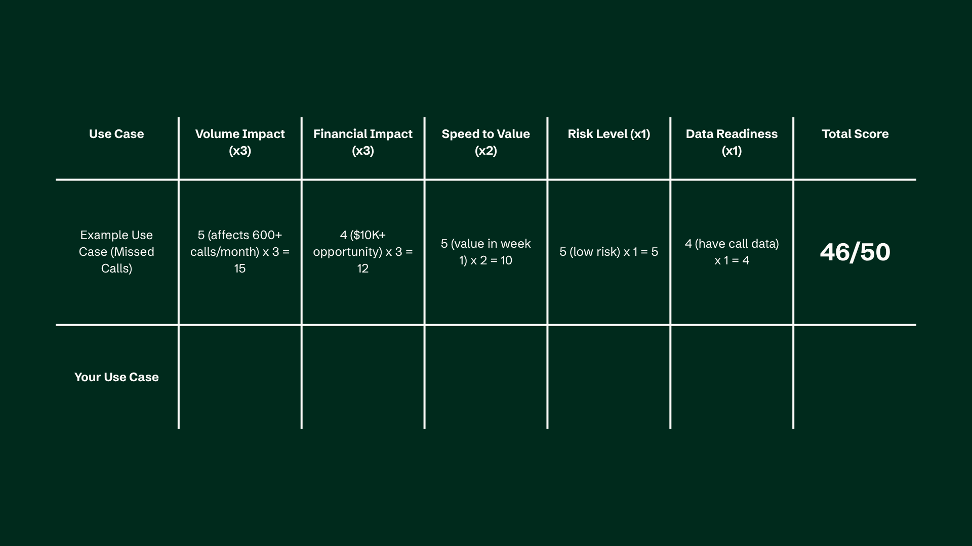 1. Identify High‑Impact Use Cases: This ideally comes from the company's already existing yearly goals and priorities, or problems that are discussed at board level or monthly executive reviews. e.g., reduce missed calls by 50%, reduce no‑shows by 25%, increase case acceptance by 10%, reduce Customer Acquisition Cost (CAC) by 20%.